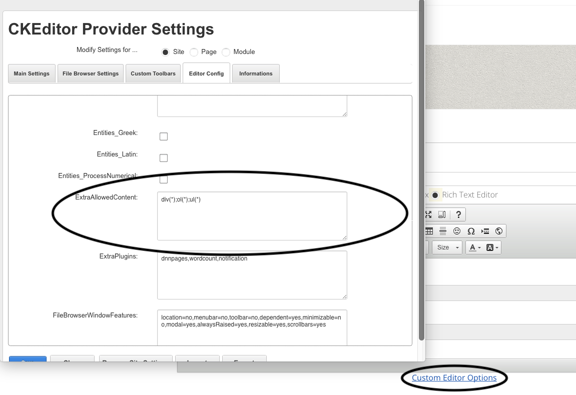 Scroll down to the ExtraAllowedContent box and insert your configuration-option, when you ar done, hit save and close and reopen the editor